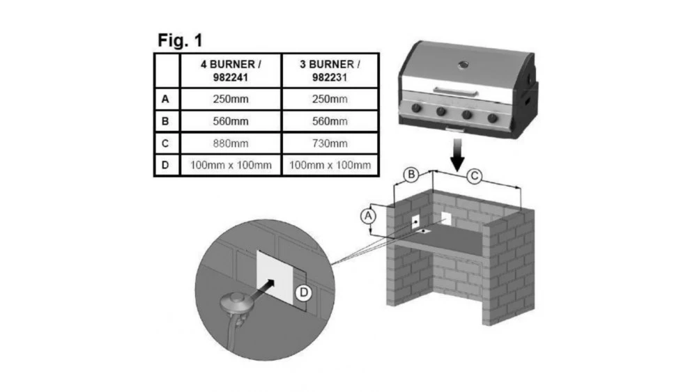The installation must allow sufficient space at the bottom of the BBQ, to allow continuous airflow to the burners. (Appr. 40mm)
